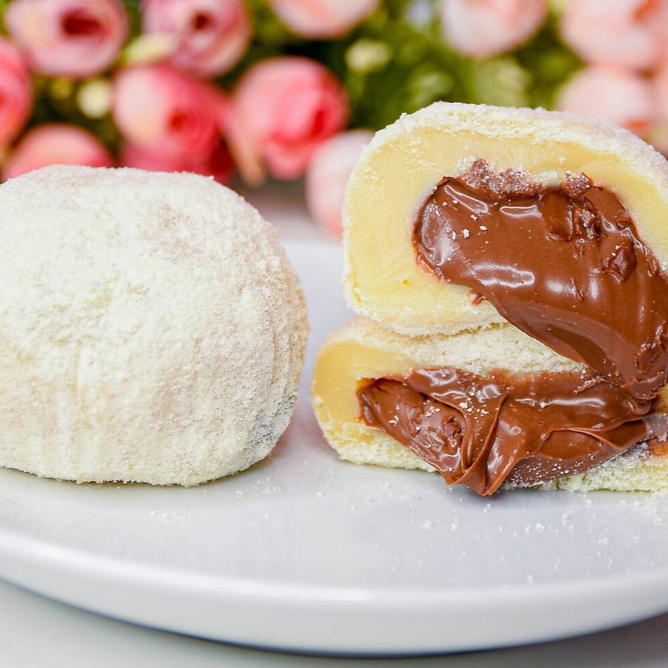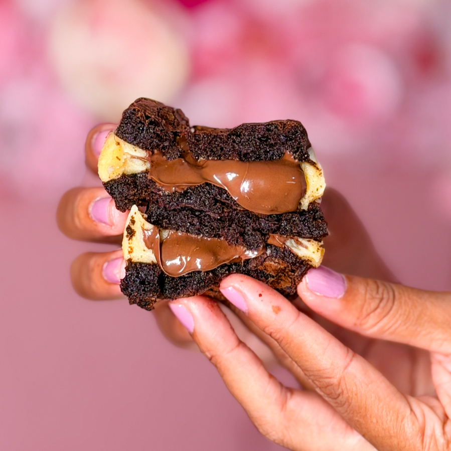 Delicioso brownie bem molhadinho com casquinha crocante, recheado com brigadeiro suave de leite Ninho e Nutella pura. Aproximadamente 80g