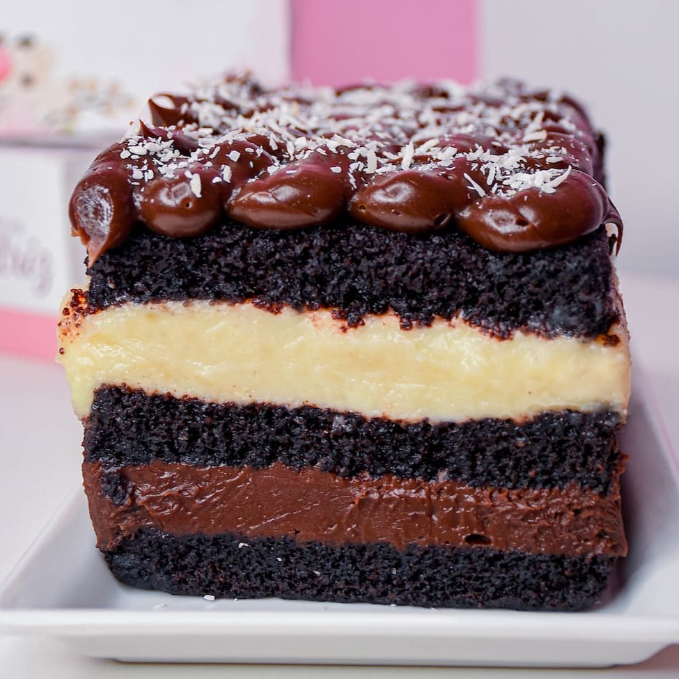 Massa de chocolate molhadinha com um delicioso recheio de ganache de chocolate que derrete na boca e brigadeiro de coco cremoso. Aproximadamente 200g