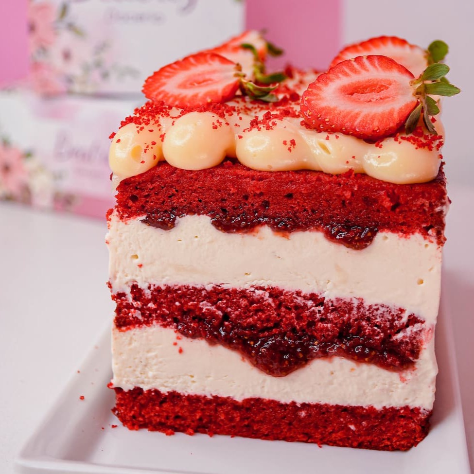 Massa veludo vermelho molhadinha com recheio especial de Cream Cheese e geleia caseira de morango. Aproximadamente 200g