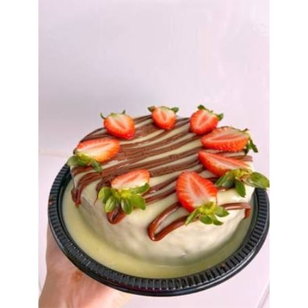 Massa de chocolate molhadinha com cobertura de leite Ninho com Nutella pura, finalizado com morangos frescos. Pesa entre 600g e 700g