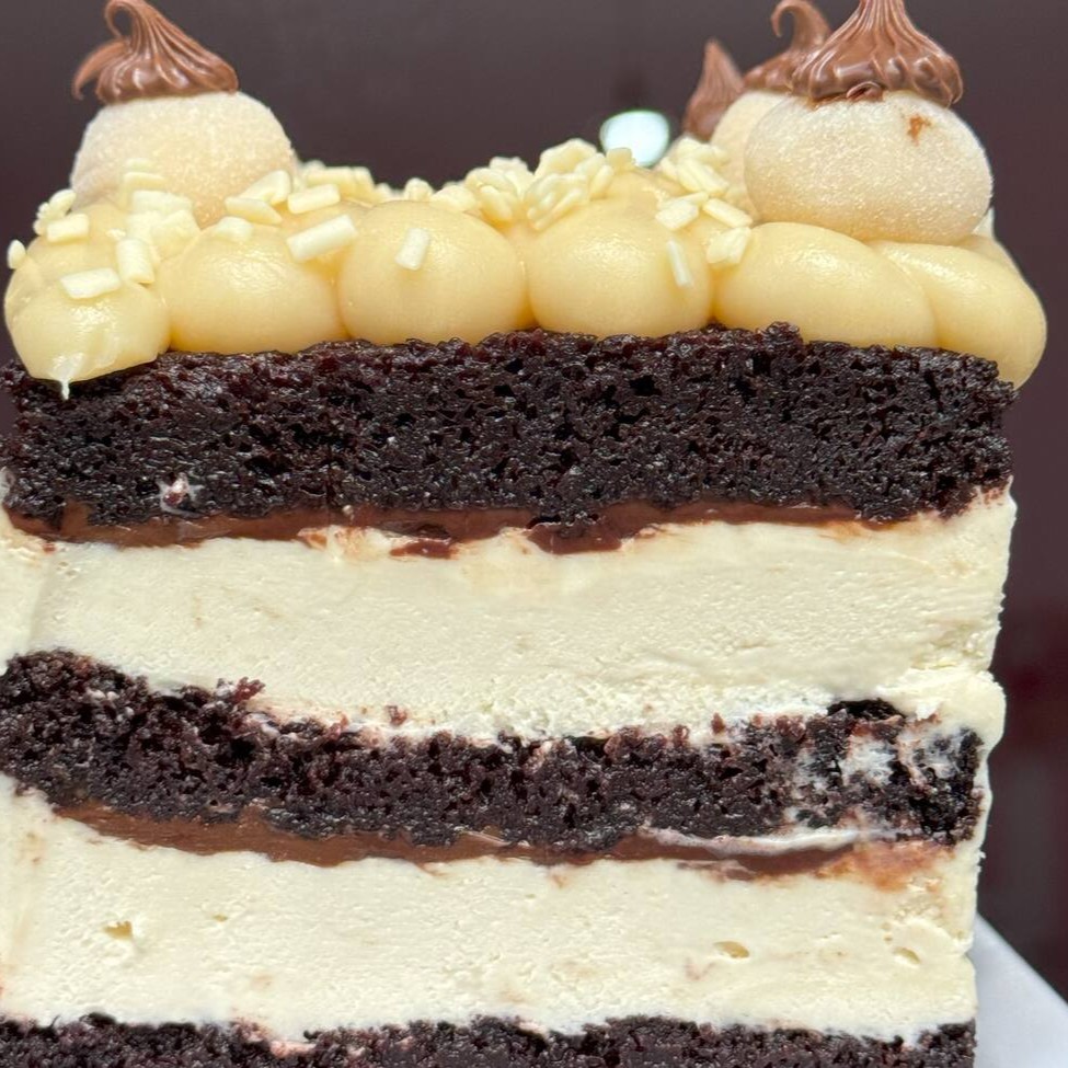 Deliciosa torta com massa de chocolate bem molhadinha e recheios de mousse de leite Ninho com Nutella. Aproximadamente 200g