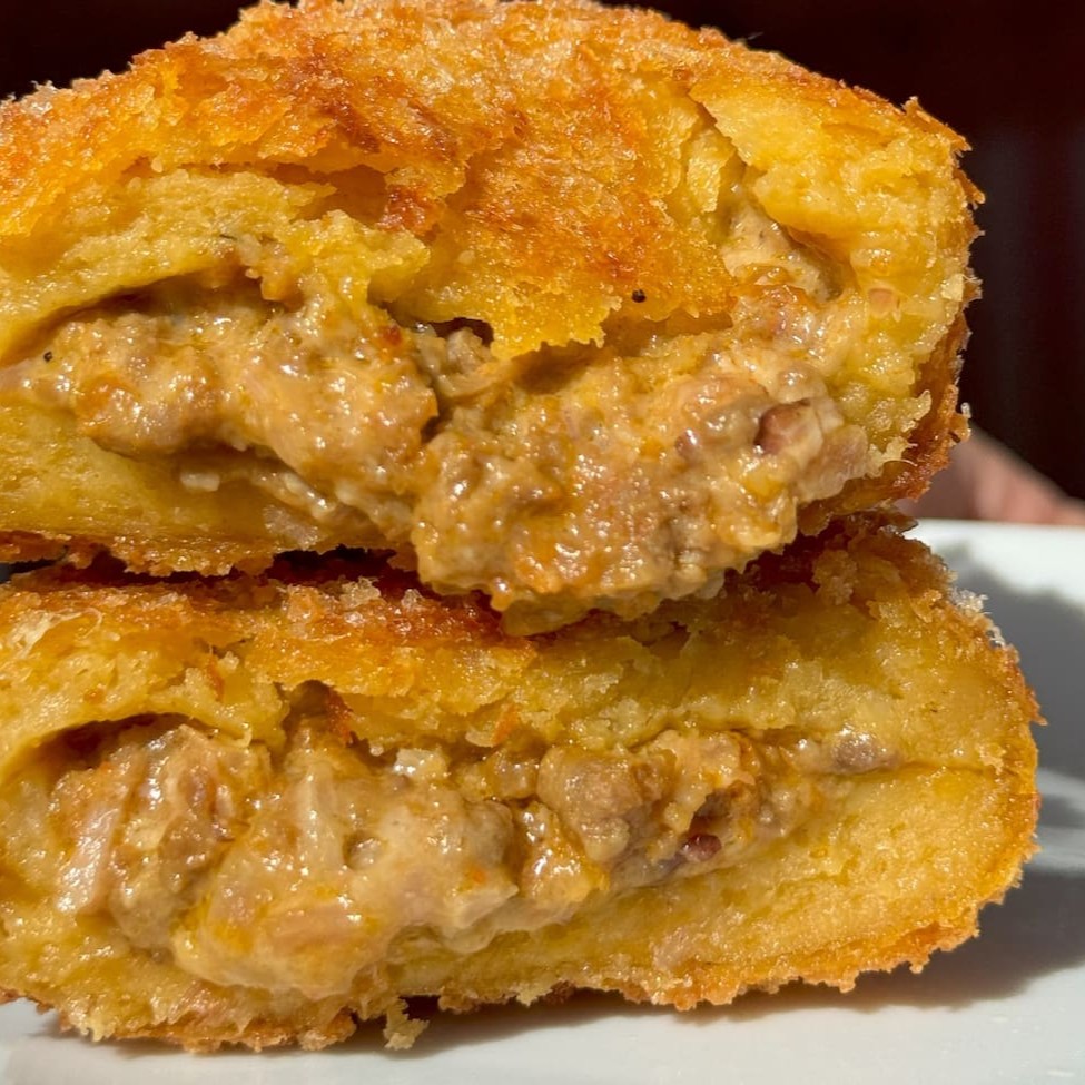 Massa macia e crocante por fora, recheio delicioso de carne moída, cubinhos de bacon e queijo