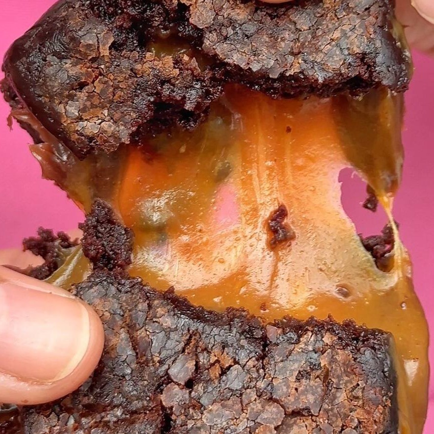 Delicioso brownie bem molhadinho com casquinha crocante, recheado com brigadeiro cremoso de chocolate ao leite e caramelo caseiro com flor de sal. Aproximadamente 80g