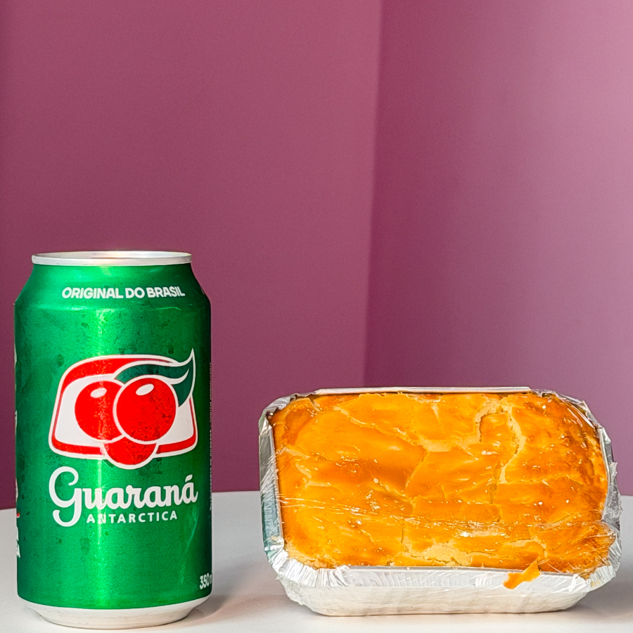 Empadão de frango com cream cheese. Refrigerante lata de 350ml. Sabor do refrigerante de acordo com a disponibilidade.
