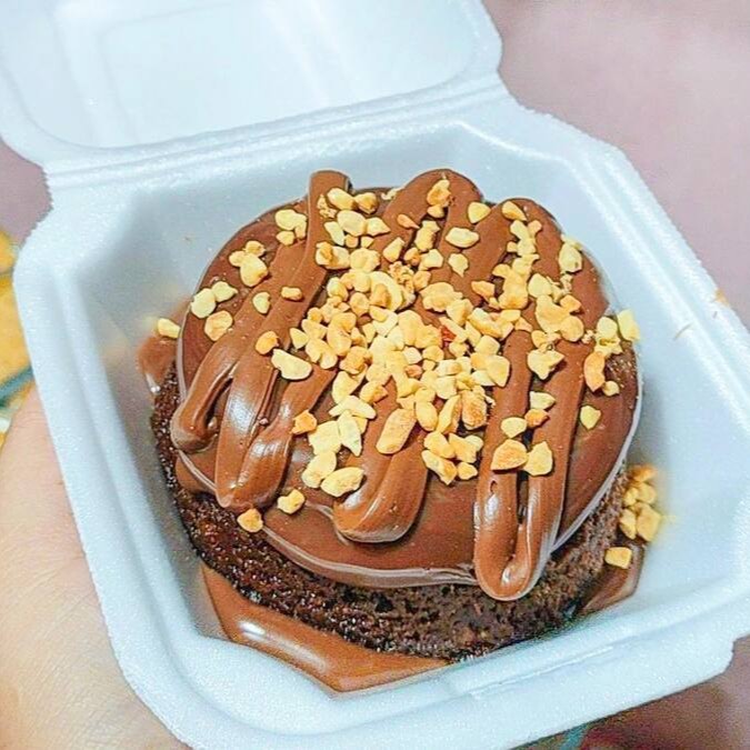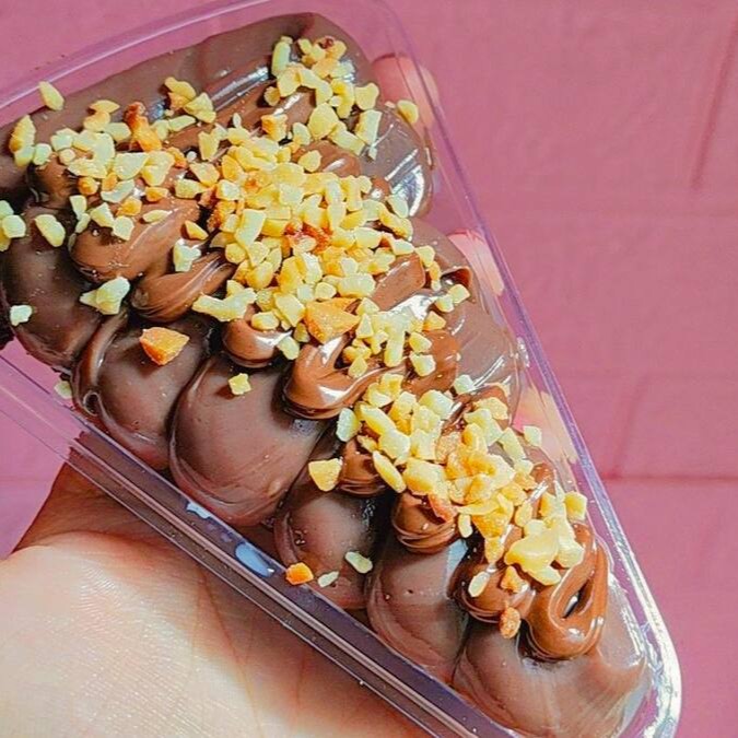 Massa chocolatuda com a cobertura de chocolate ao leite quentinho finalizado com amendoim granulado e Nutella pura Original