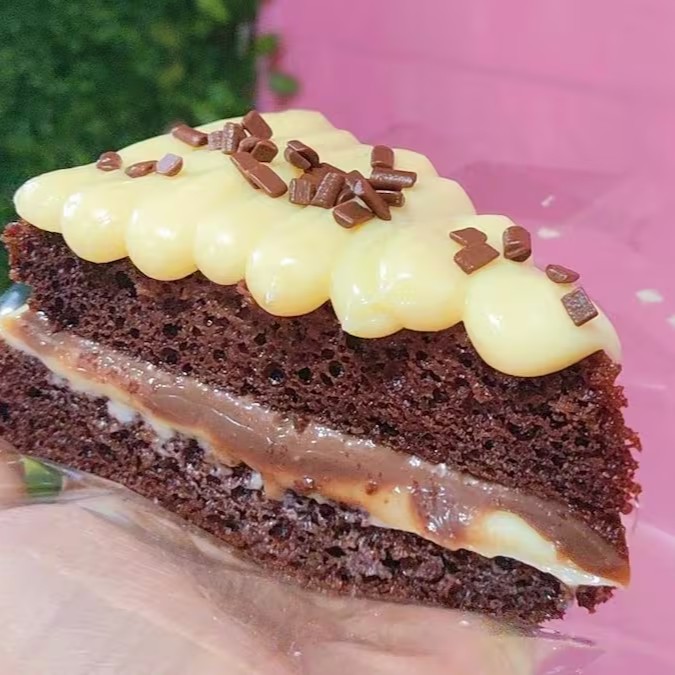 Fatia generosa de massa de chocolate super fofinha, recheada com brigadeiro cremoso de cacau e camada especial de Ninho, tudo finalizado com brigadeiro de creme de Ninho e granulados de chocolate belga