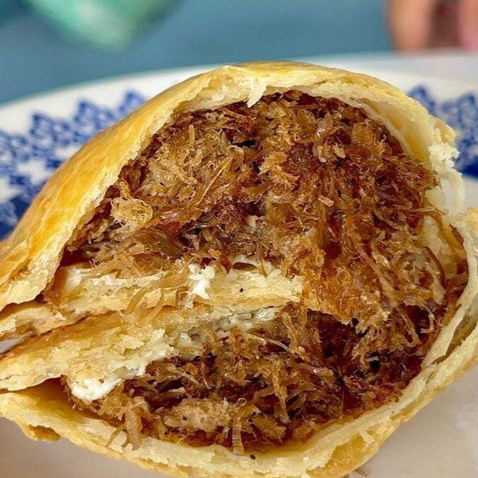Massa folhada, carne de sol desfiada, requeijão e gratinado com queijo mussarela.