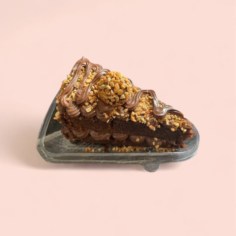 Generosa fatia de bolo com massa de chocolate e duas camadas de recheio: brigadeiro ao leite e brigadeiro de leite Ninho, finalizada com creme de avelã e leite Ninho polvilhado.. (Aprox: 300g)