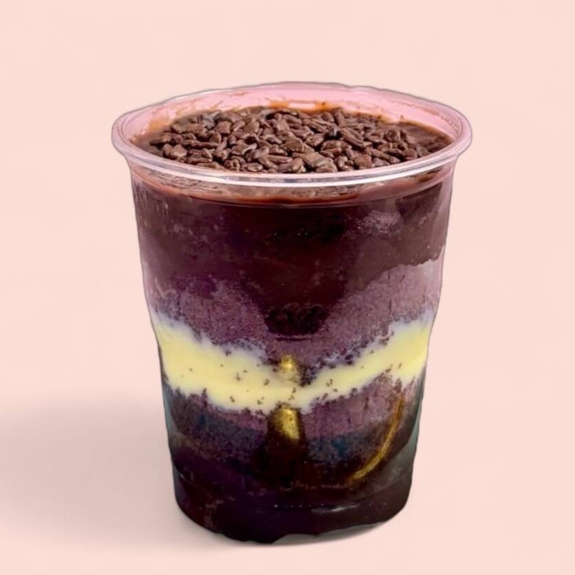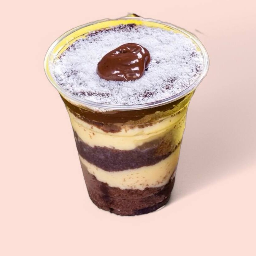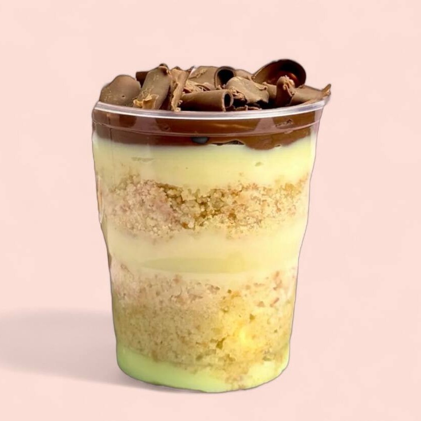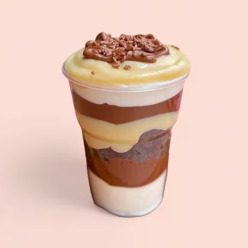 Massa de leite, creme de Ninho cremoso, brigadeiro de Ninho, finalizado com creme de avelã e raspas de chocolate. (Copo 250 ml)