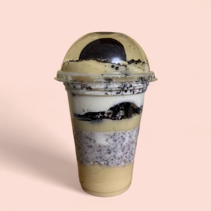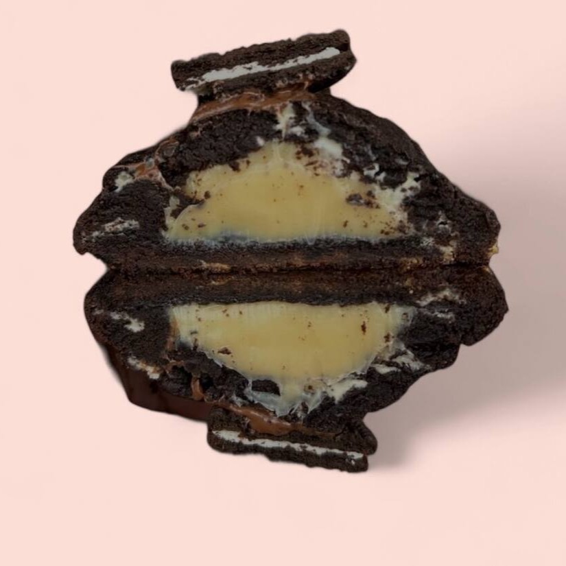 Massa de cookie black com gotas de chocolate branco, recheio de baunilha e pedaços de Oreo. (Aprox: 150 gramas)