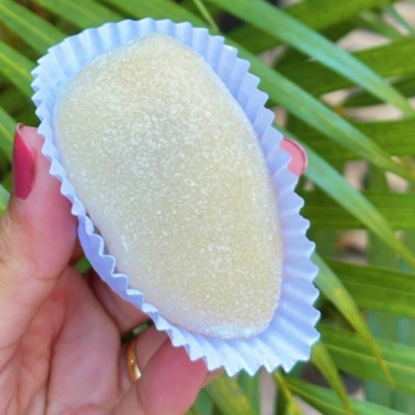 Morango fresquinho envolvido em brigadeiro de leite Ninho e finalizado com granulado de chocolate branco.