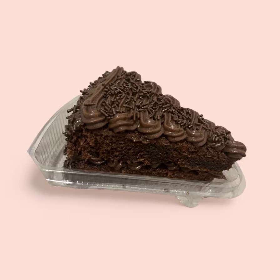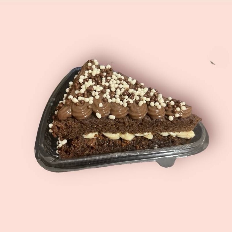 Generosa fatia de bolo com massa de chocolate e duas camadas de recheio de brigadeiro ao leite e finalizado com granulados de chocolate. (Aprox: 300g)