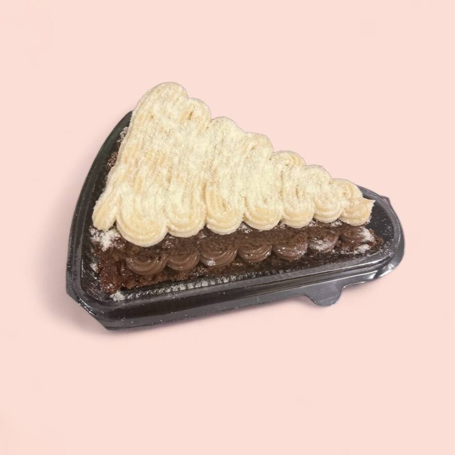 Generosa fatia de bolo com massa de chocolate e duas camadas de recheio: brigadeiro ao leite e brigadeiro de leite Ninho, finalizada com leite Ninho polvilhado. (Aprox: 300g)