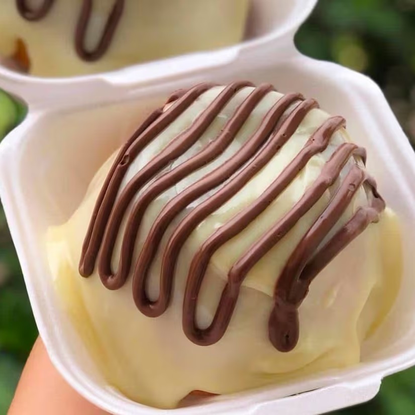 Um delicioso bombom de morango, composto por um suave creme de Ninho, morangos, brigadeiro branco e brigadeiro ao leite.