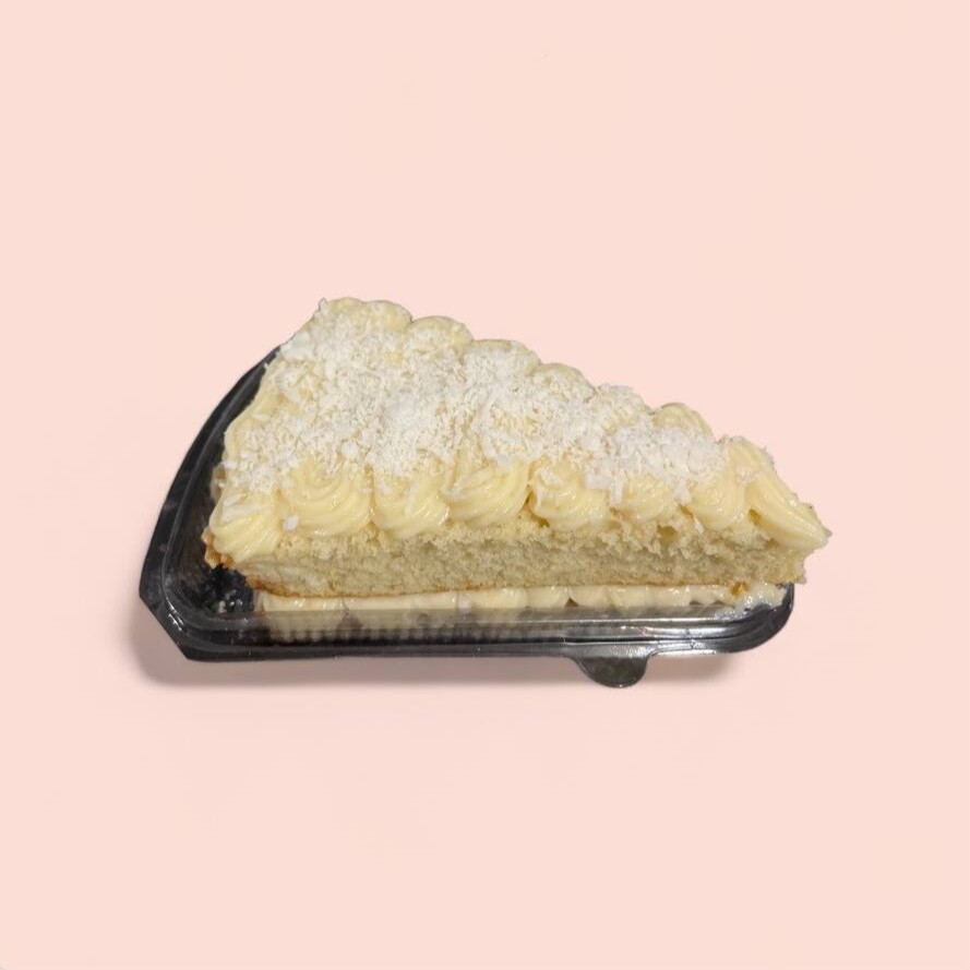 Generosa fatia de bolo de leite com duas camadas de recheio de beijinho de coco finalizado com coco ralado. (Aprox: 300g)