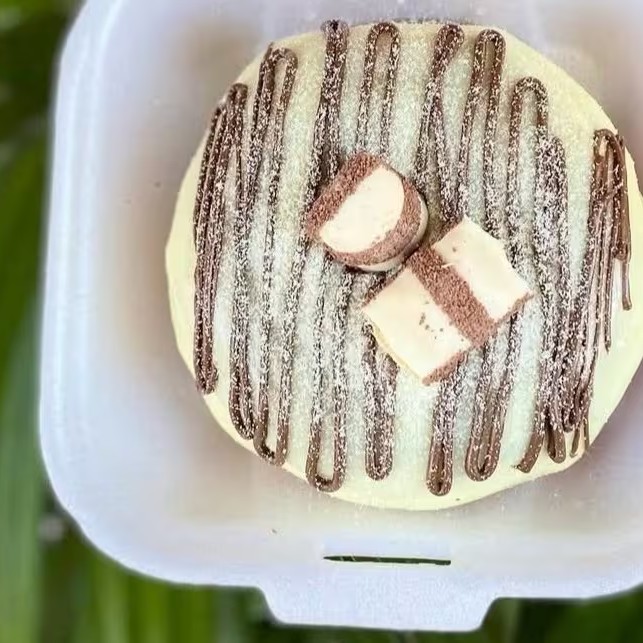 Massa de baunilha ou chocolate fofinha, recheio puro de Kinder Bueno no centro, coberto com recheio Ninho, finalizado com Nutella e Kinder Bueno.