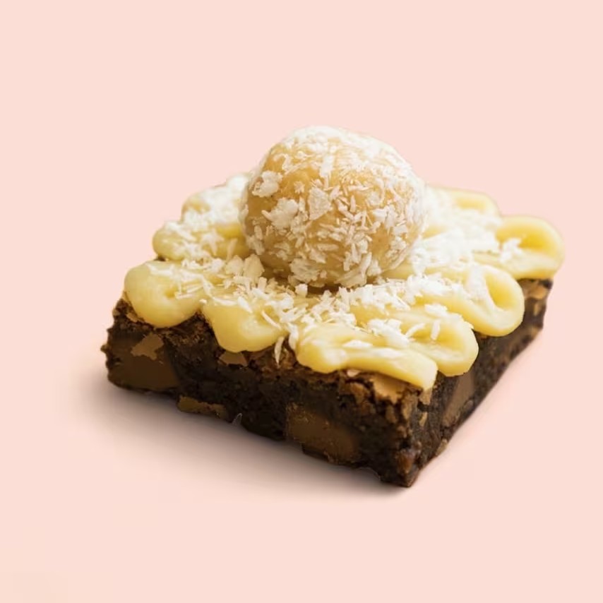 Brownie coberto com brigadeiro de beijinho, polvilhado com raspas de coco. (Aprox: 160g)
