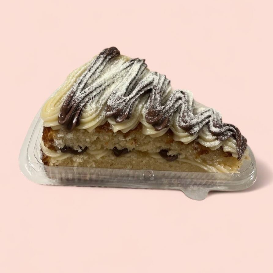Generosa fatia de bolo com massa de leite e duas camadas de recheio de brigadeiro de leite Ninho finalizado com creme de avelã e leite Ninho polvilhado. (Aprox: 300g)