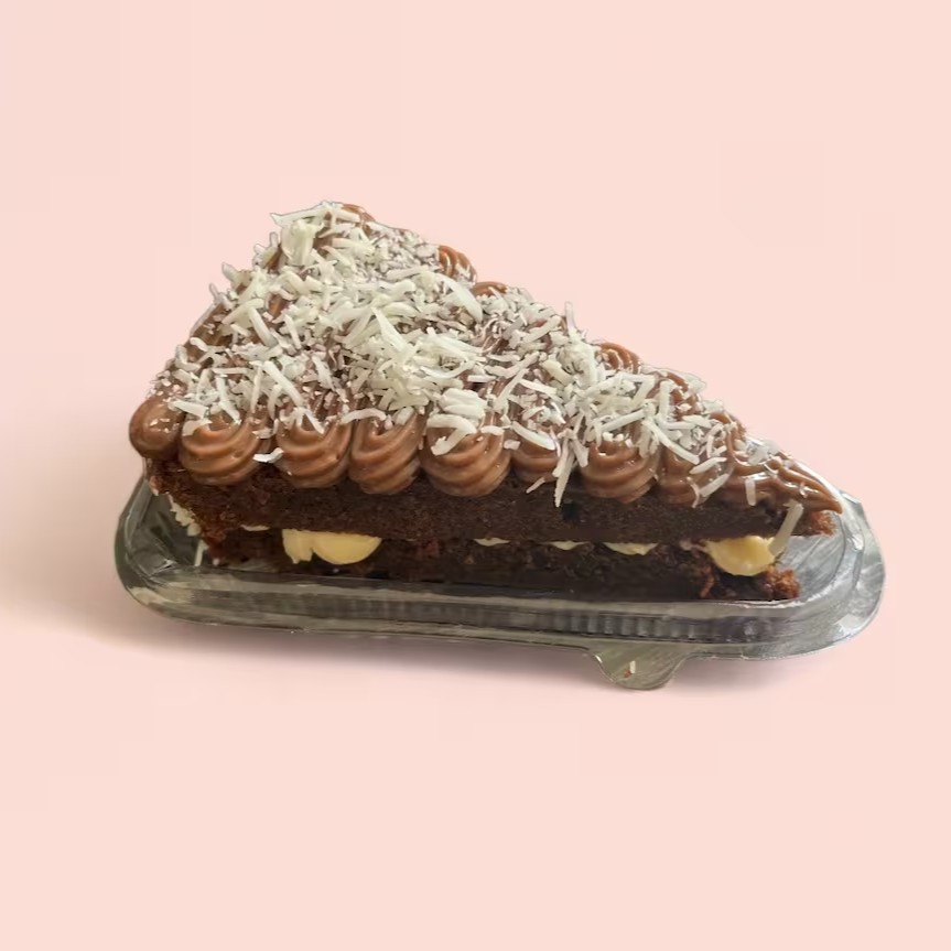 Generosa fatia de bolo com massa de chocolate e duas camadas de recheio: beijinho de coco cremoso e ao leite, finalizada com coco ralado. (Aprox: 300g)