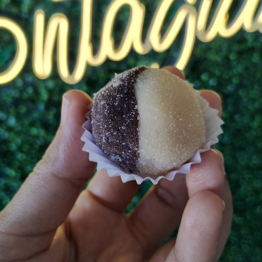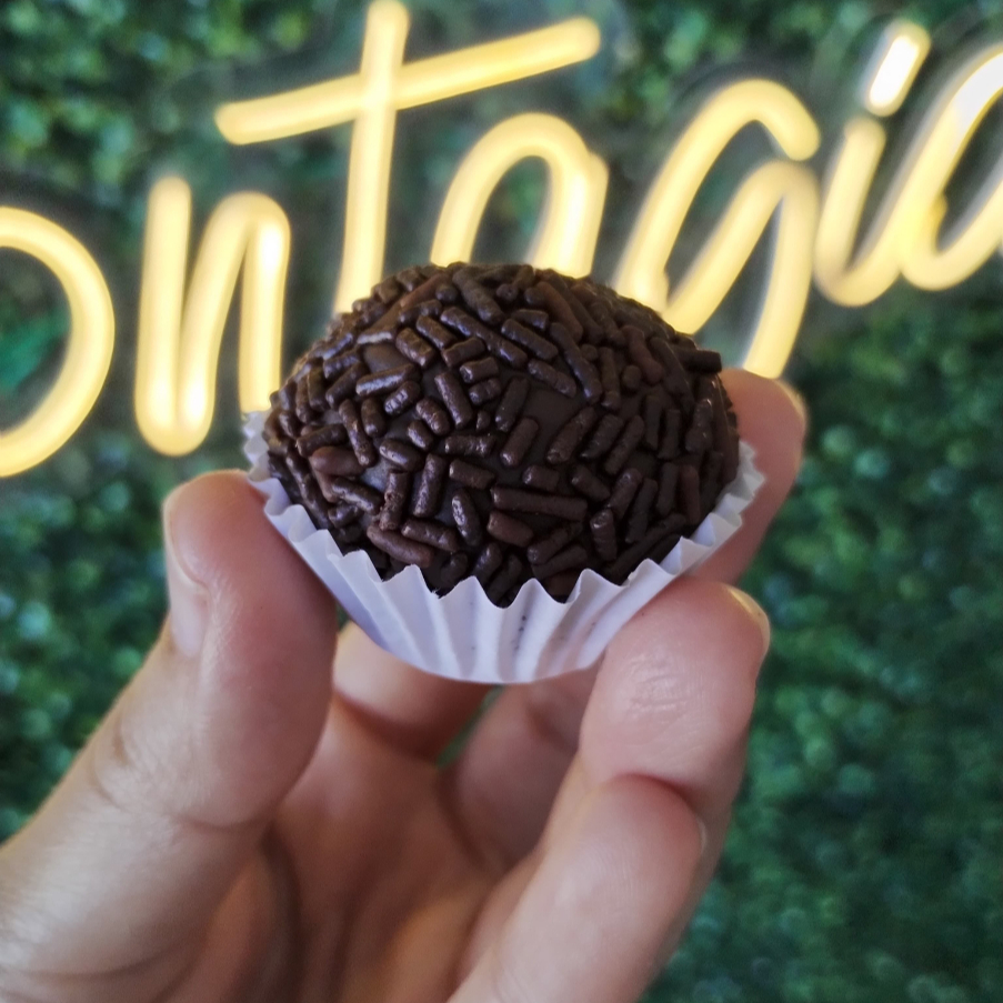 Bombom de chocolate meio amargo, recheado com brigadeiro 50% Peso aproximado 35g.