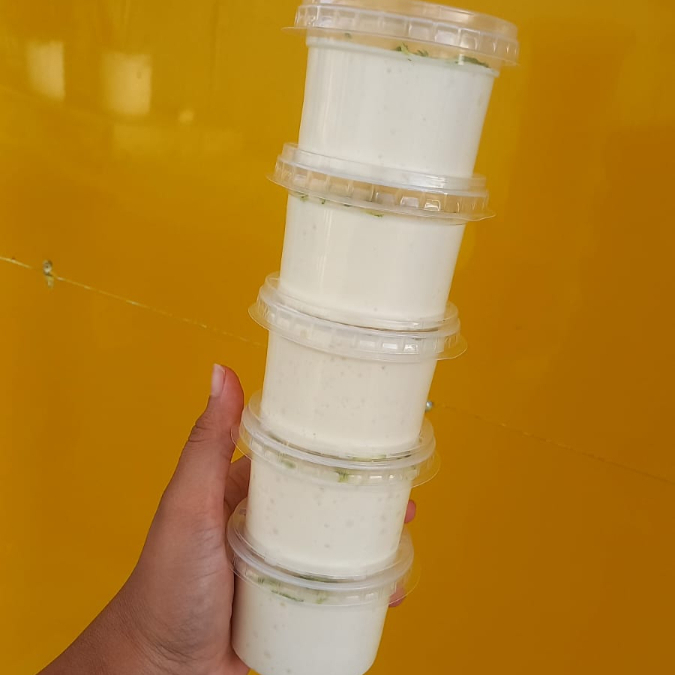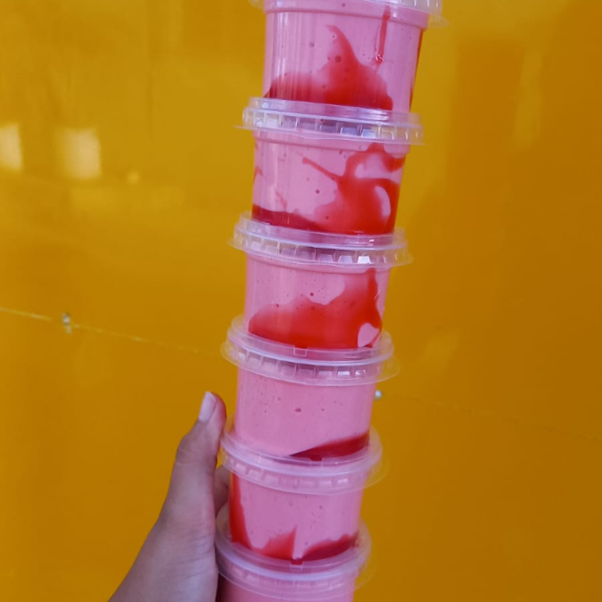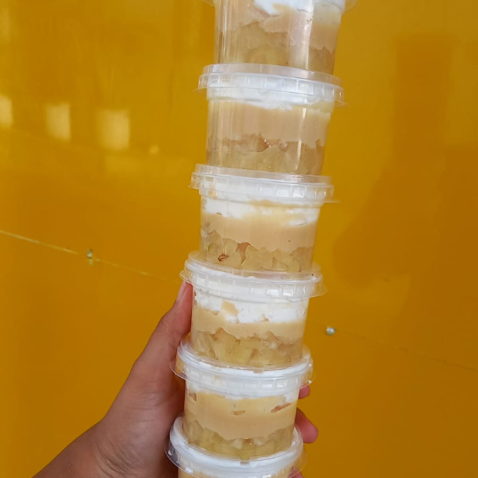 uma camada de abacaxi caramelizado, mais uma camada de brigadeiro branco e finalizado com chantininho.
