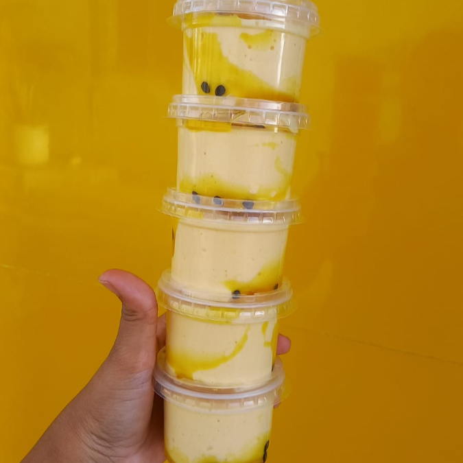 Mousse cremoso de maracuja, finalizado com calda de maracuja.