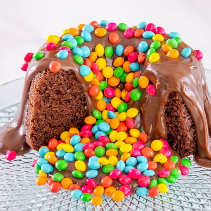 Massa de chocolate, recheio de chocolate e Confete colorido.
