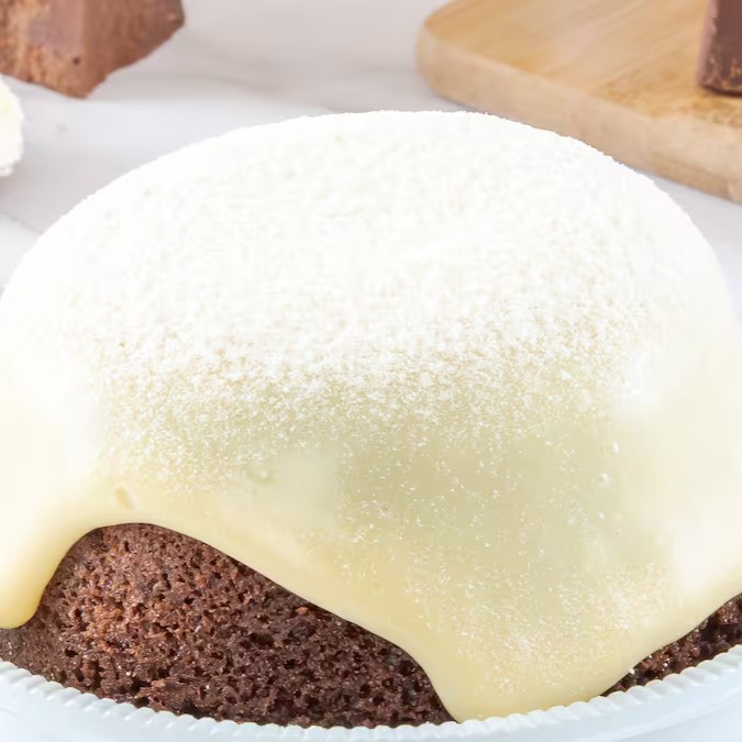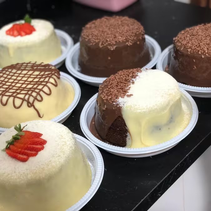 Bolo Vulcão de Leite Ninho — massa de baunilha super fofinha, coberta com um delicioso creme de leite Ninho que transborda a cada corte! Um sabor suave e irresistível, perfeito para quem ama doces cremosos e equilibrados. Serve até 5 pessoas — ideal para adoçar momentos especiais em família ou presentear alguém querido!