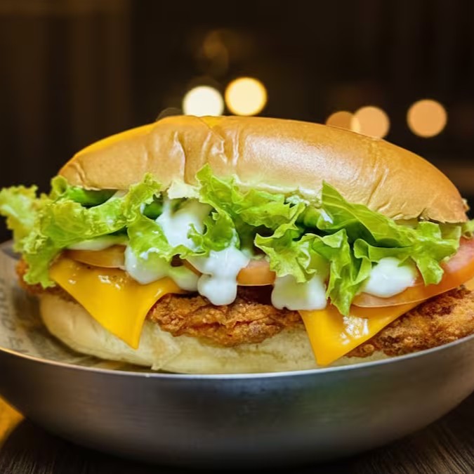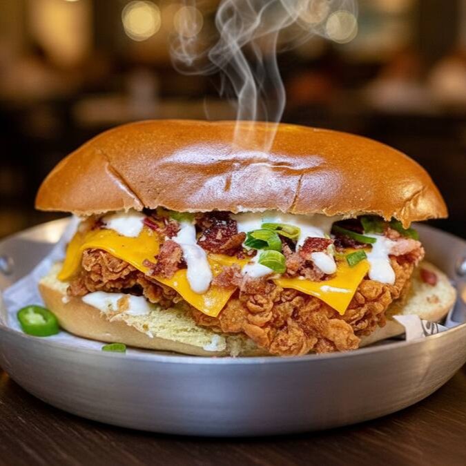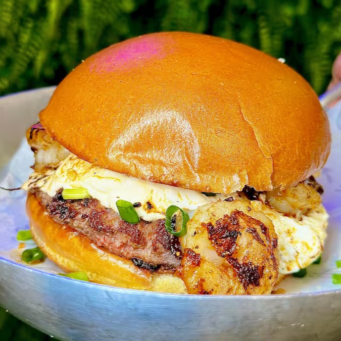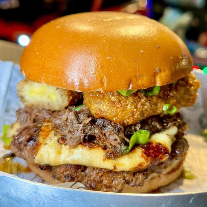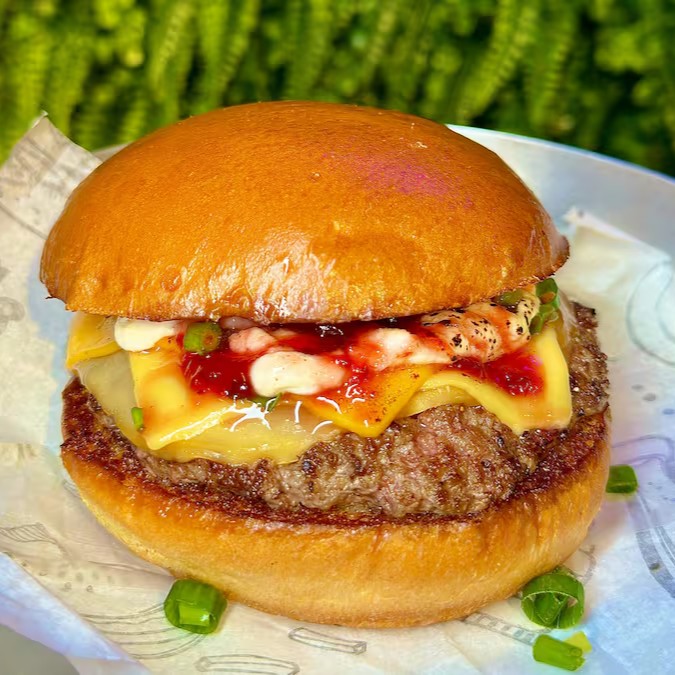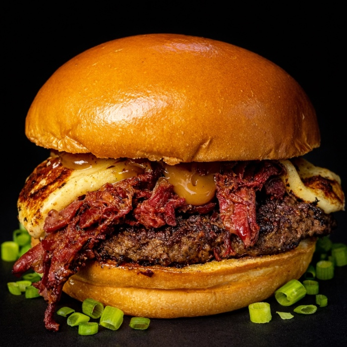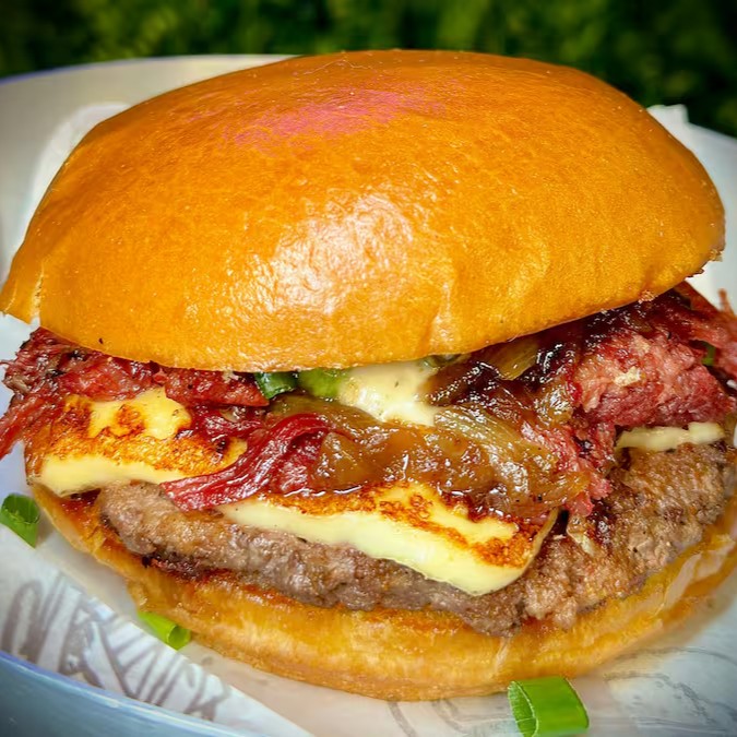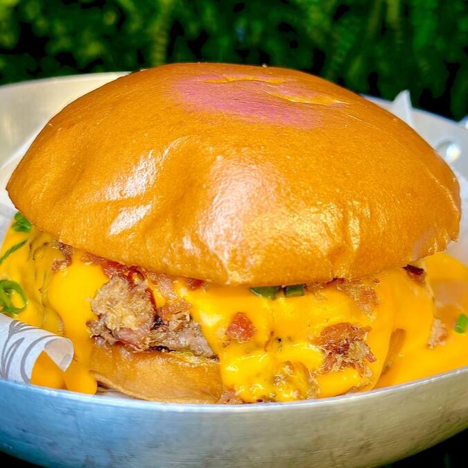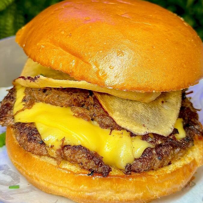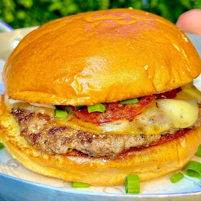 Burger de blend de bovino, queijo cheddar fatiado, cebola caramelizada, crispy de bacon, cheddar melt e um toque de cebolinha, uma maionese caseira especial da casa.