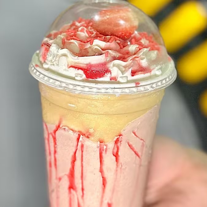 Delicie-se com nosso irresistível milk-shake de morango, cuidadosamente adornado com calda de morango, chocolate branco e leite Ninho. Acompanhado pelo delicioso chantininho e frescos pedaços de morango e Pink granulados!! Uma verdadeira explosão de sabor em cada gole!