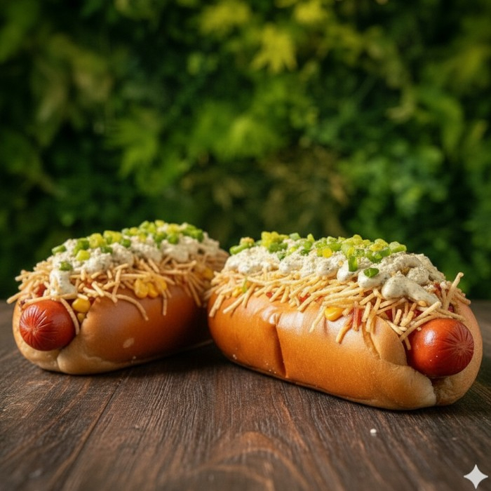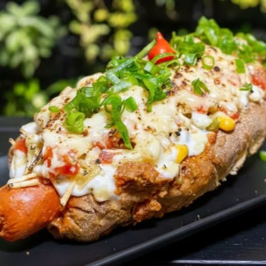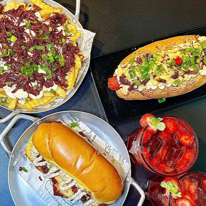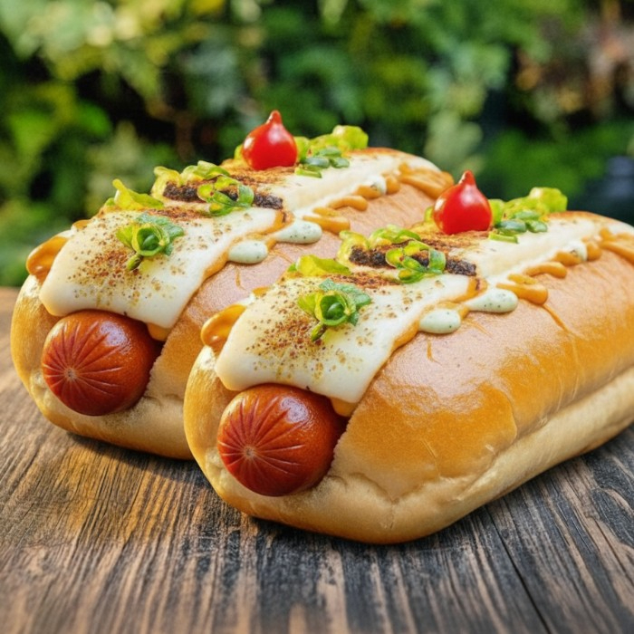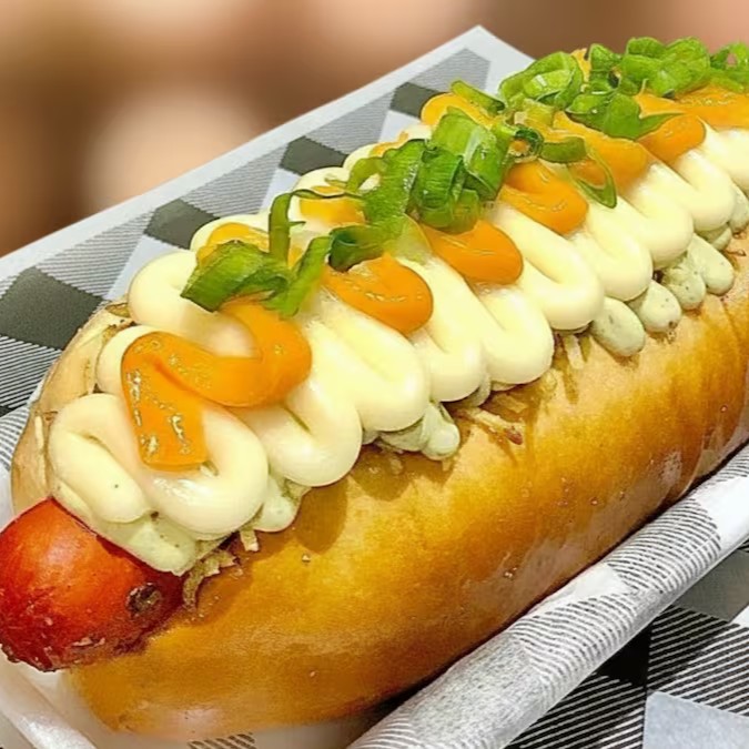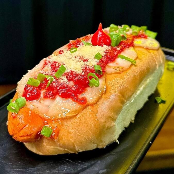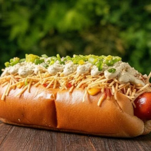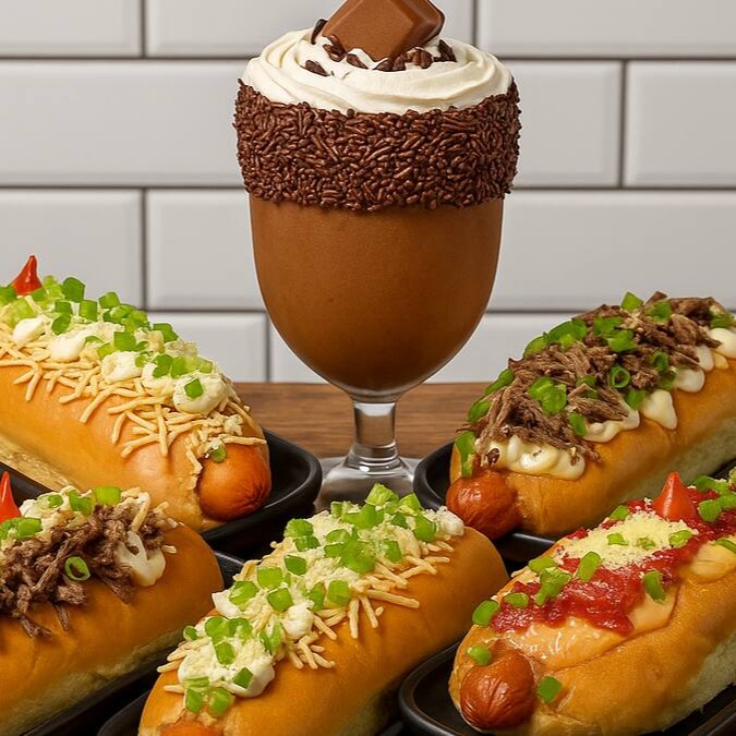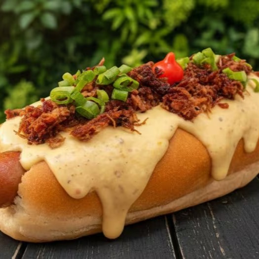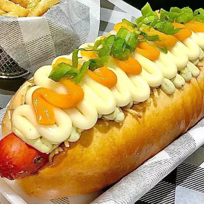 Salsichas suculentas envoltas em um molho de tomate irresistível, acompanhadas de vinagrete fresco, queijo provolone maçaricado, maionese cremosa, geleia de tomate, queijo ralado e um toque de cebolinha. Sabor que conquista!