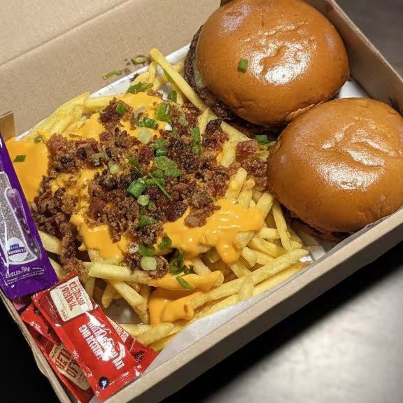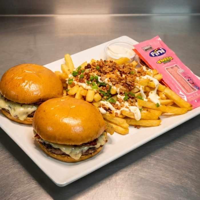 Combo com 2 Burgers com bacon, porção de batatas fritas com cream cheese e bacon. Acompanha maionese, barbecue e 2 Finni.