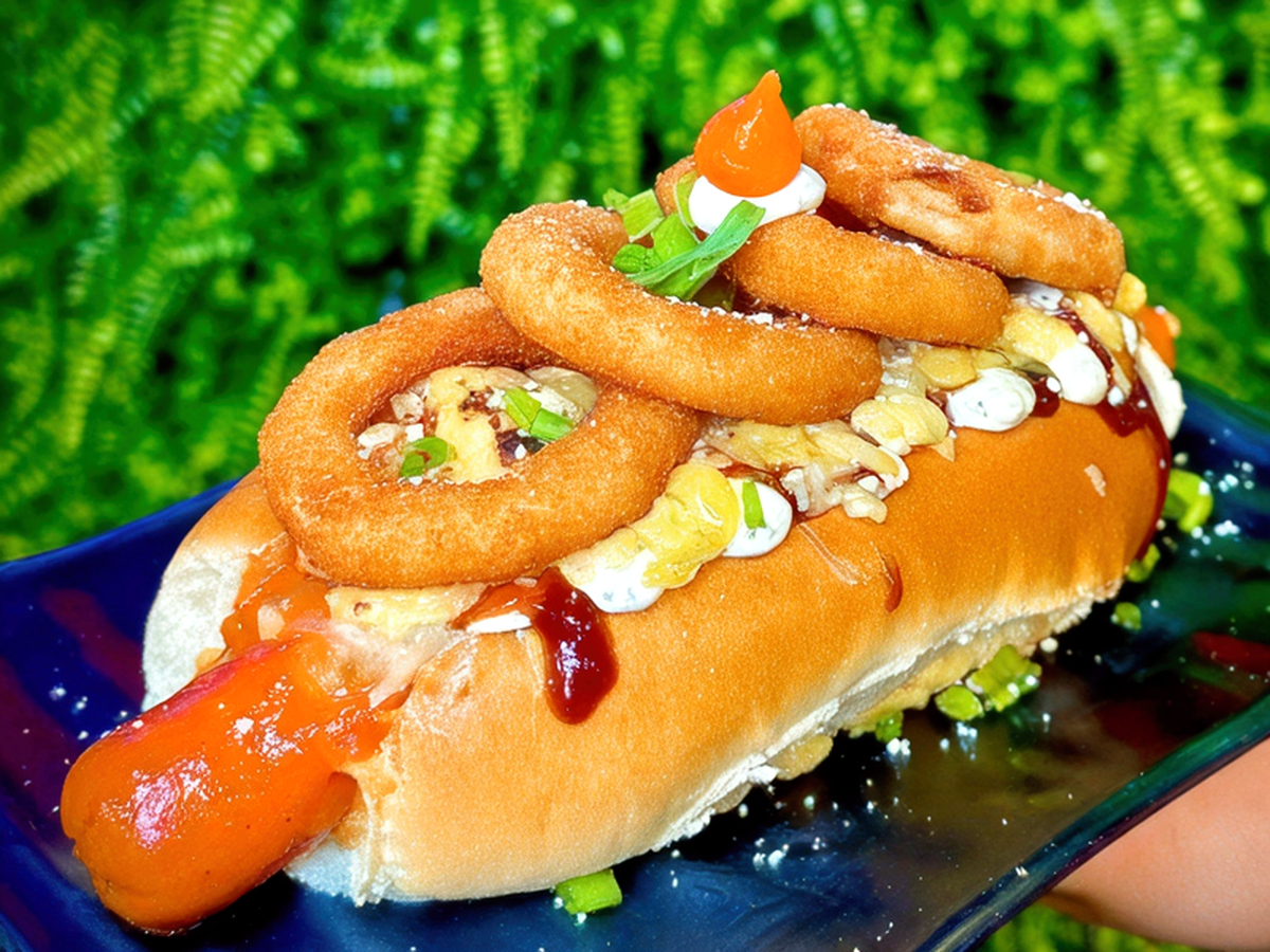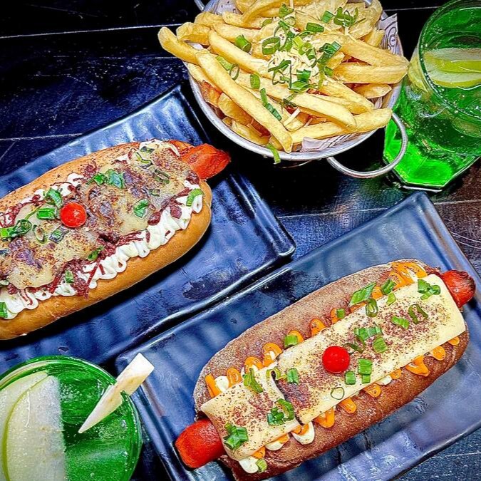 Salsichas suculentas em molho de tomate caseiro, servidas com vinagrete, queijo ralado, molho barbecue, molho de parmesão, queijo muçarela maçaricado e onion rings crocantes.