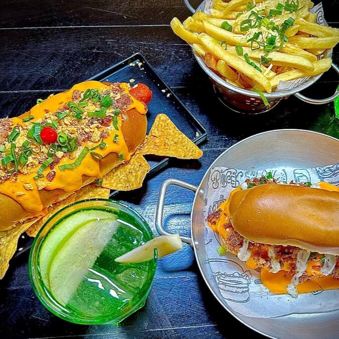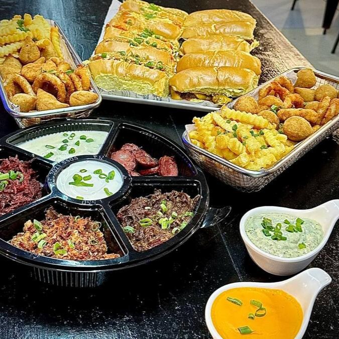 Combo que serve até 6 pessoas, com 10 pães (burger ou hotdog) roleta com bacon, charque desfiada, calabresa, costela Bbq, molho blue, maioneses, acompanha cheddar artesanal da casa e 2 cestas de petiscos com batatas, coxinhas, aneis de cebola e nuggets.