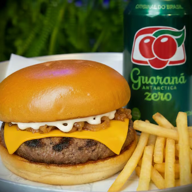 X Burger com pão, carne, queijo prato, cebola caramelizada e maionese, acompanhado de fritas e um Guaraná Antarctica 350ml, por apenas R$ 39,90.