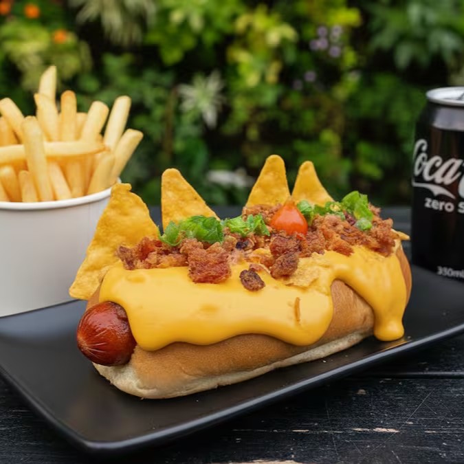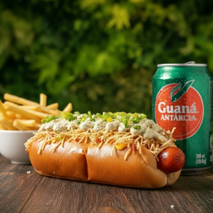 hotdog com molho à bolonhesa, vinagrete, batata palha, maionese caseira, ketchup, dueto de milho e ervilha e queijo ralado. Acompanha uma porção de batata frita e um refrescante Guaraná Antarctica 350ml