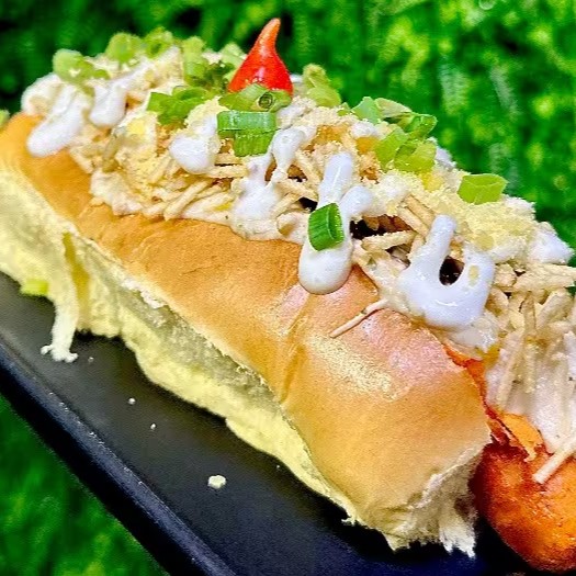 Experimente o irresistível Hotdog de Salpicão! Duas salsichas suculentas mergulhadas em molho de tomate caseiro, com creme de frango, batata palha crocante, queijo ralado, cenoura, azeitona, uvas passas, maionese caseira e toques de cebolinha. Uma delícia!