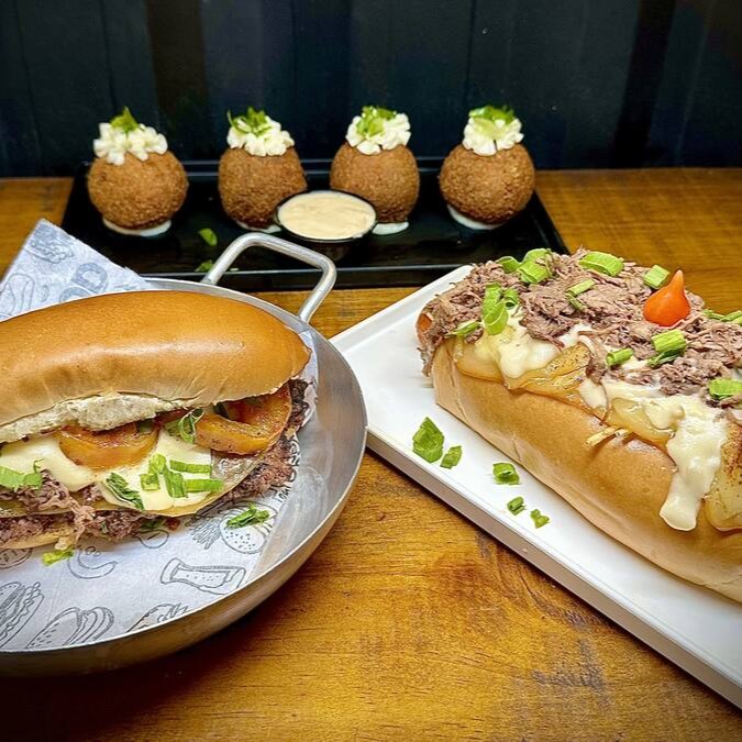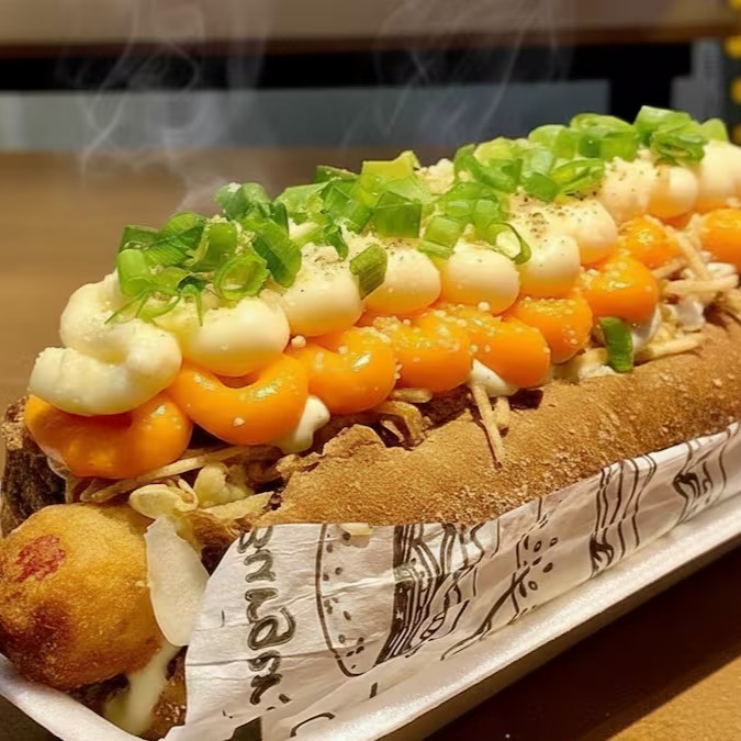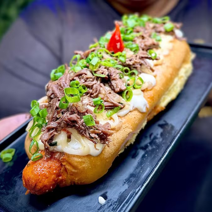 Delicioso hotdog gourmet com suculenta costela bovina desfiada ao molho barbecue, 2 salsichas clássicas, vinagrete fresquinho, purê de batatas cremoso, maionese especial, toque de cebolinha e irresistível queijo Mussarela maçaricado. Uma explosão de sabores!
