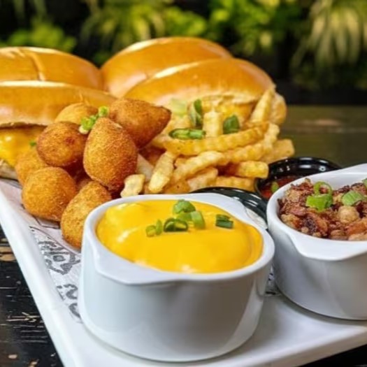 Nosso incrível combo, que inclui 4 hambúrgueres smash mini, fritas crocantes, mini coxinhas, uma piscina de cheddar derretido artesanal ou molho de queijo gorgonzola, crispy de bacon, maionese e ketchup. Uma explosão de sabores em um só pedido!