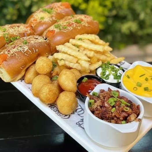 Nosso incrível combo, que inclui 4 hotdog mini, fritas crocantes, mini coxinhas, uma piscina de cheddar derretido artesanal ou molho de queijo gorgonzola, crispy de bacon, maionese e ketchup. Uma explosão de sabores em um só pedido!