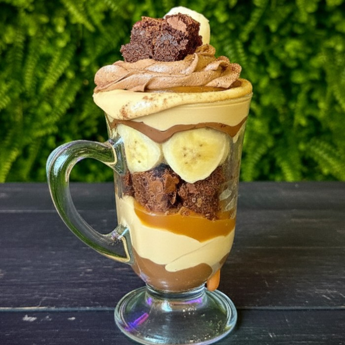 Copo da Felicidade com creme de doce de leite, brigadeiro, banana, pedacinhos de brownie, chantilly de chocolate e um toque de canela.
