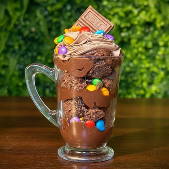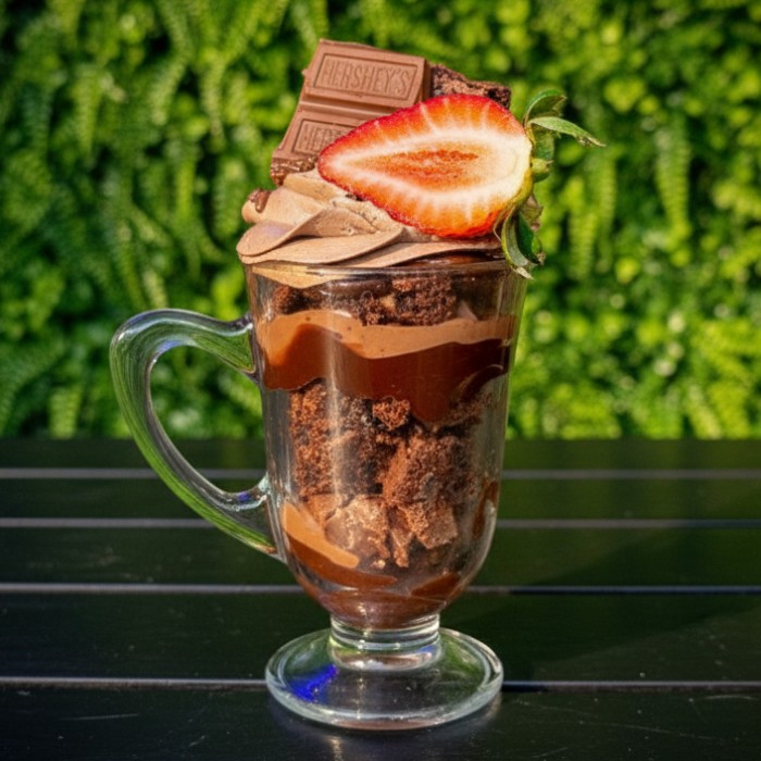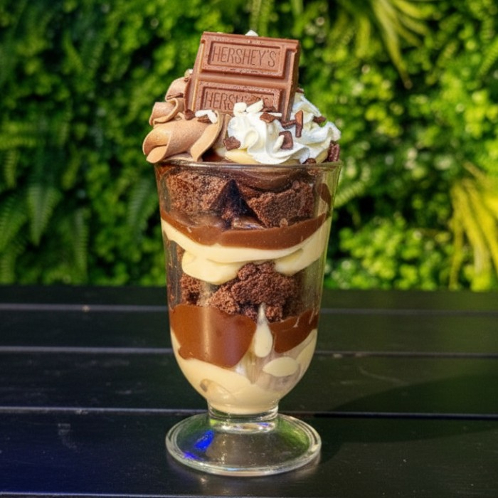 Copo da Felicidade: uma deliciosa combinação de brownie, brigadeiro, pedaçinhos de chocolate e um suave chantilly.