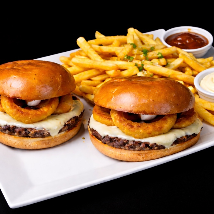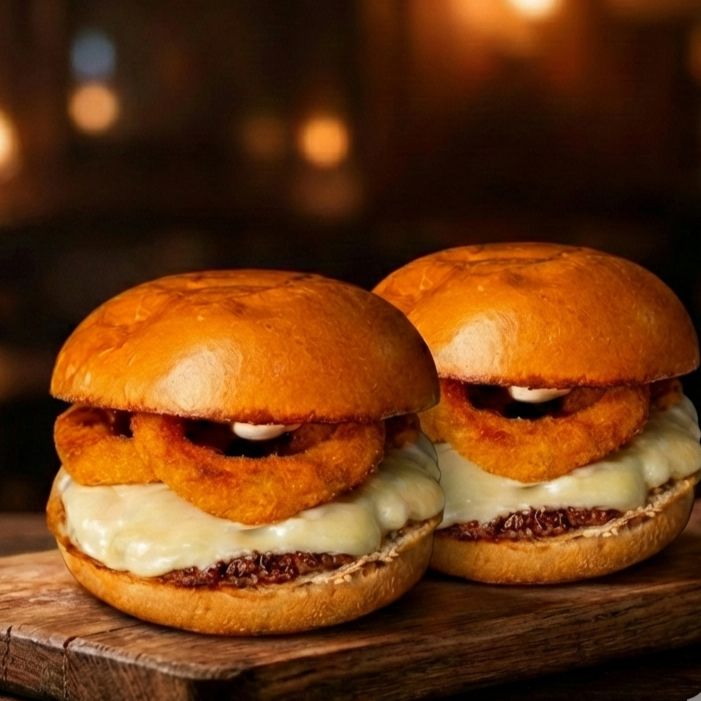 2 Burger com aneis de cebola empanados, com queijo mussarela derretido, molho bbq e maionese da casa por apenas R$ 34,90