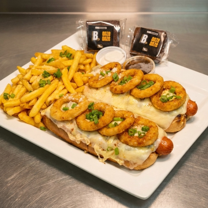 Combo com 2 hotdog onion, porção de batatas fritas. Acompanha maionese, barbecue e 2 Brownie.