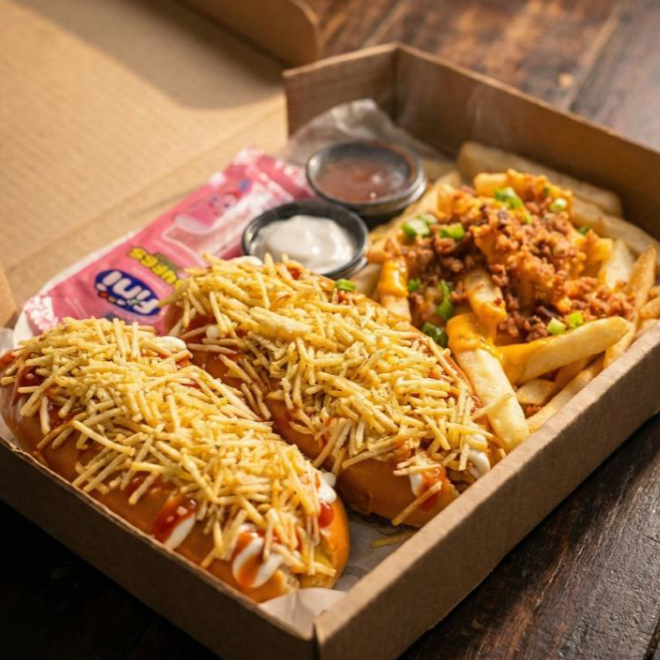 Combo com 2 hotdog (salsicha, carne moida, dueto, maionese e ketchup, batata palha e queijo ralado), porção de batatas fritas cobertas com cheddar artesanal e bacon. Acompanha ketchup maionese caseira e 2 Finni.
