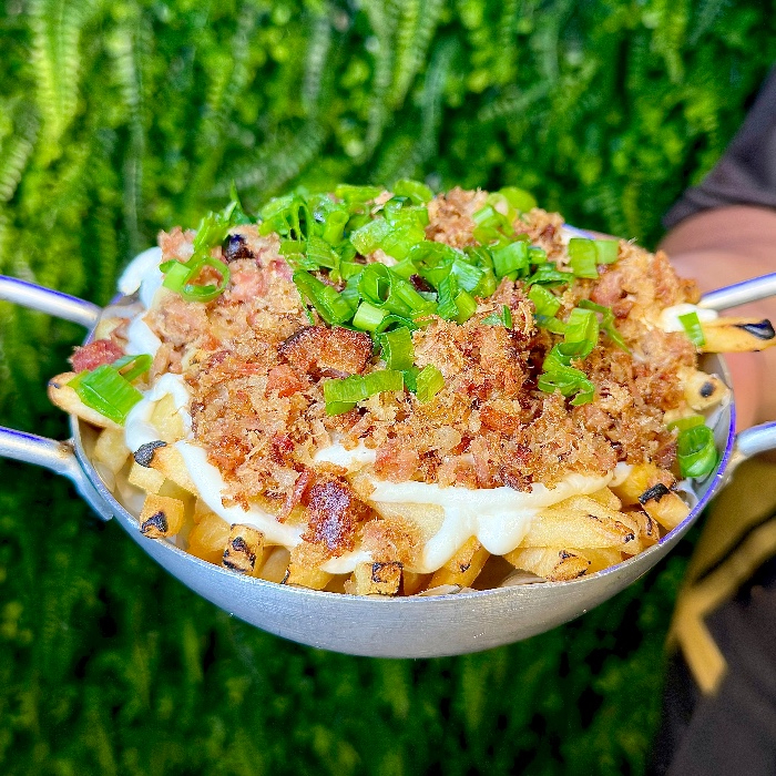 Batata frita, com cream cheese e bacon e um leve toque de cebolinha.