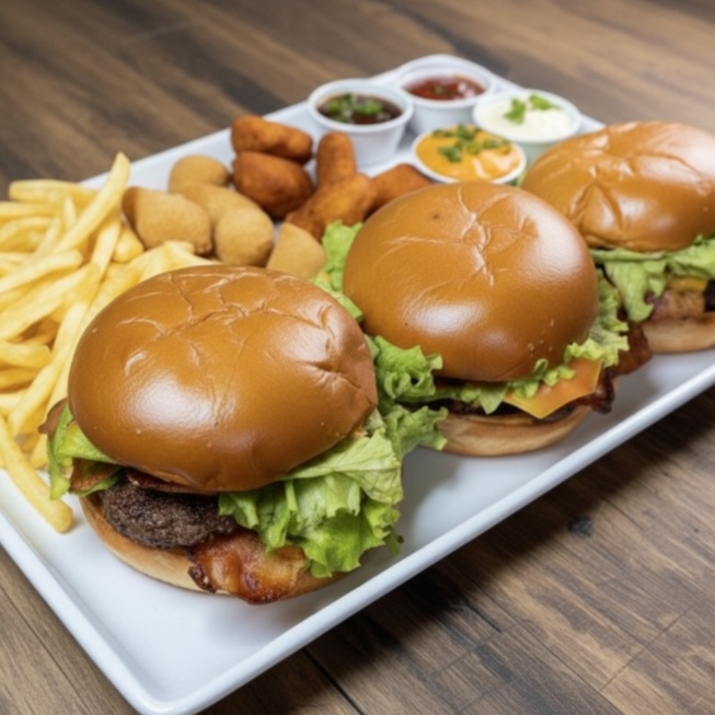Combo com 3 suculentos burgers no pão brioche com blend bovino, salada fresca, bacon e maionese especial. Acompanhado de batatas fritas, coxinhas de frango, nuggets e porções de molhos: maionese, ketchup, barbecue e cheddar caseiro.