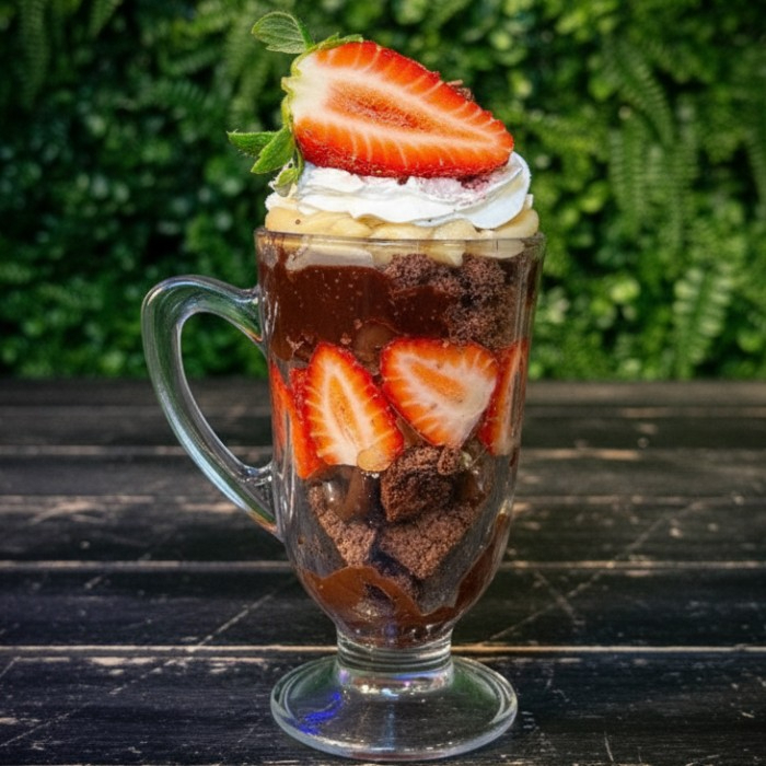 Copo da Felicidade: delicie-se com camadas irresistíveis de brownie, morango fresquinho, geleia de morango, brigadeiro, brigadeiro branco e um toque leve de chantilly.