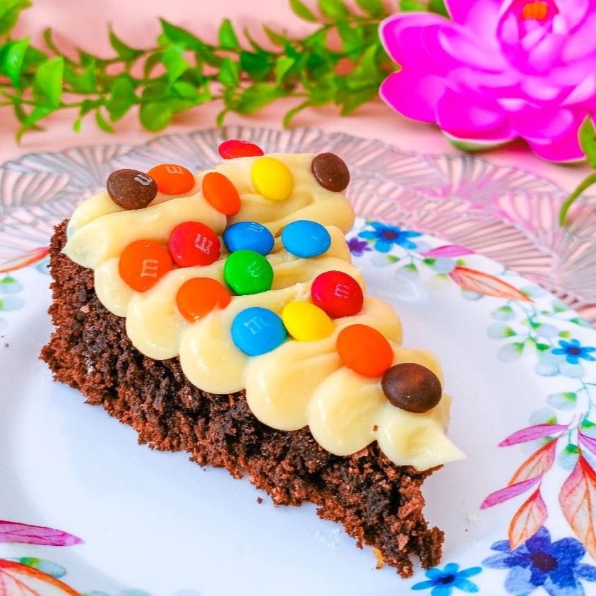 Fatia de Brownie de Chocolate com Brigadeiro de Ninho e M&ms