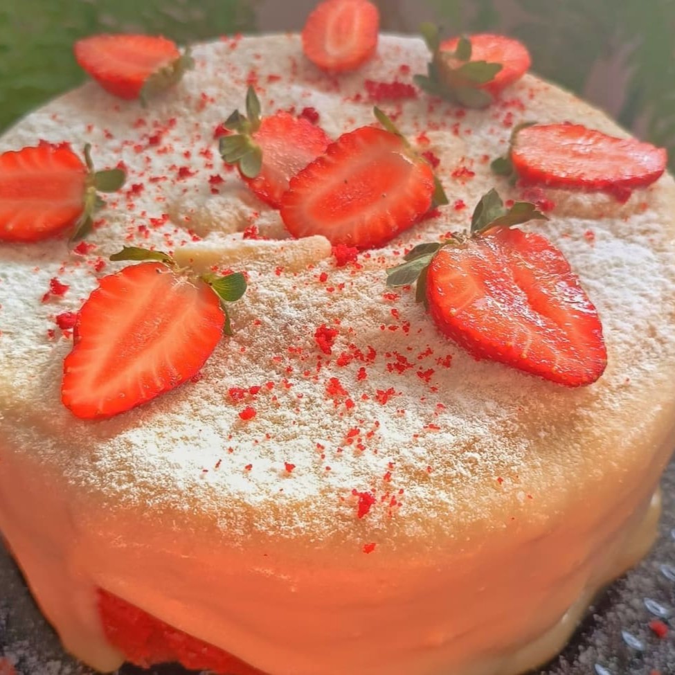 Puro prazer em cada fatia! Nosso bolo com a massa fofinha é uma explosão de sabor irresistível! Massa aveludada, Recheio cremoso e morangos fresquinhos para adoçar o seu Dia.